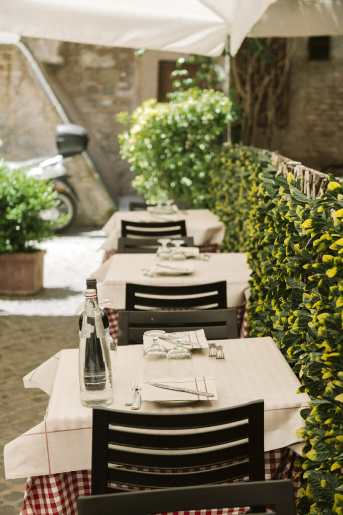 Oltre alla sala interna la trattoria Il Fantino mette a disposizione degli ospiti un apprezzato spazio esterno, per consumare pranzi e cene con una vista sulle meraviglie storiche dell’antica Roma.