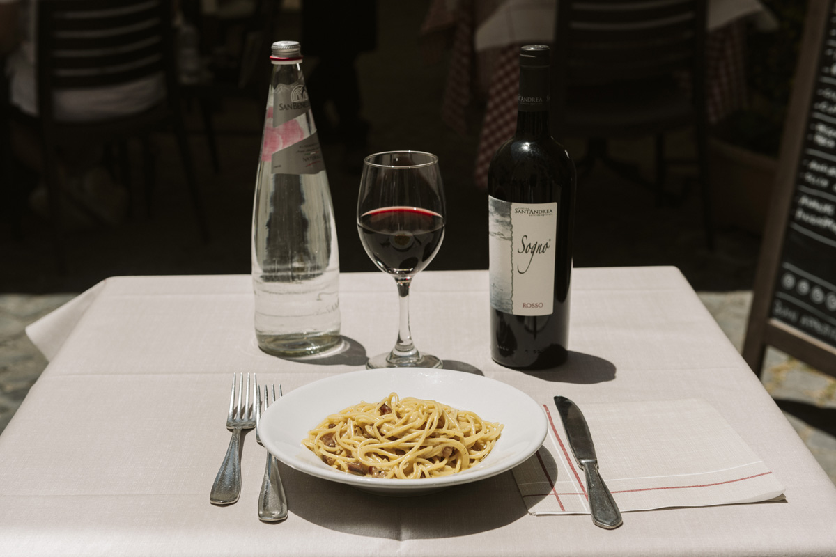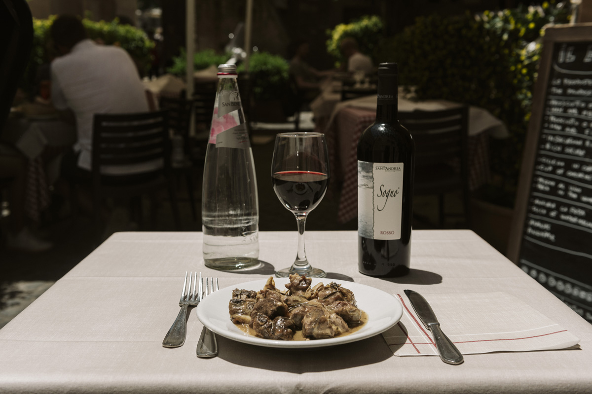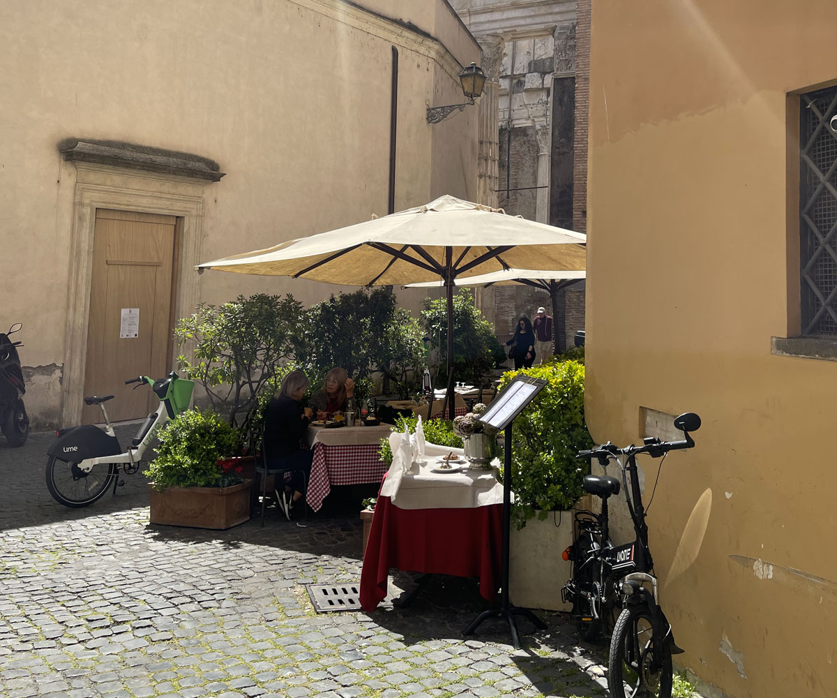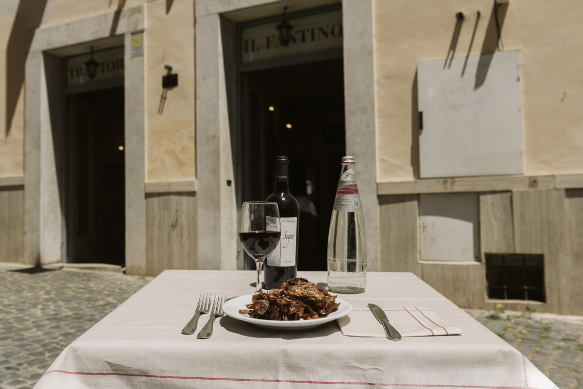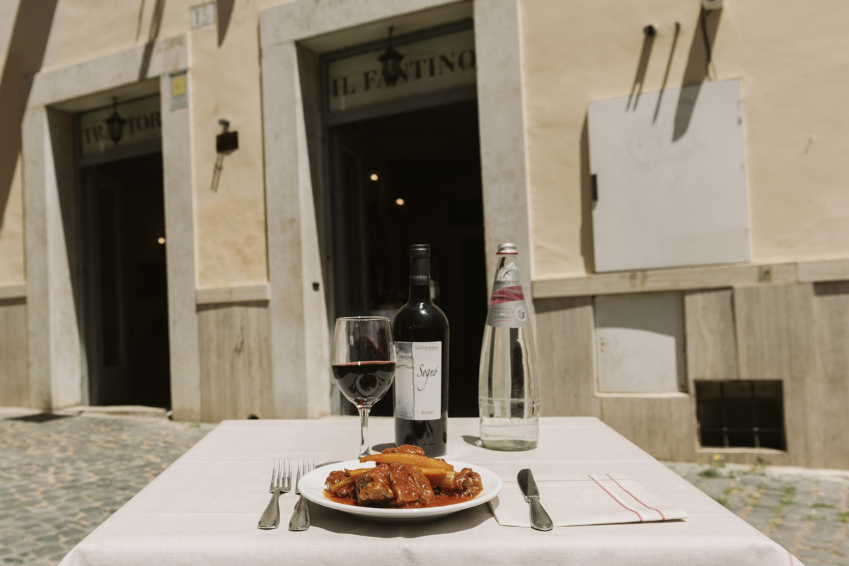Oltre alla sala interna la trattoria Il Fantino mette a disposizione degli ospiti un apprezzato spazio esterno, per consumare pranzi e cene con una vista sulle meraviglie storiche dell’antica Roma.